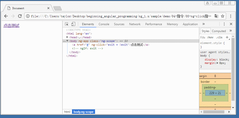 同时在这个对象中, 使用 ng-click 注册了三个点击事件, 在点击事件中, 对对应的变量取反. 即 true 变成 false,